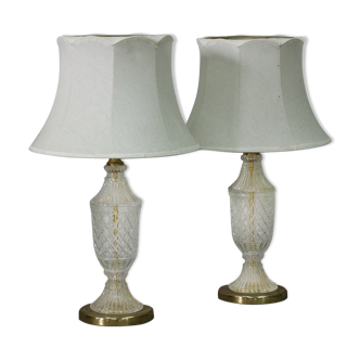 Lampe à poser, pied en verre et abat-jour en crochet années 70
