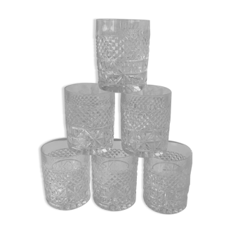 Charmant ensemble de 6 petites chopes, tasses ou verrines parfaites, en verre pressé vintage/ancien, des années 30-50. Formes cylindriques avec haut lisse, corps à reliefs de pointes diamants et pointes coupées, style art déco, rappelant certaines productions de Baccarat, petites anses fines. Avec plateau de service rectangulaire identique. 9, 5 cm de hauteur, 5, 5 cm de diamètre, 8 cm de largeur maximale avec anse. Plateau de 24, 5 cm de longueur, 16, 5 cm de largeur et 2, 5 cm de hauteur. Très bel état pour l'ensemble, 2 petits chocs détectés sur le rebord du plateau, très discrets, chopes impeccables, "froissages" du verre dus à la méthode de fabrication, discrets, petites bulles. Environ 2 kg pour l'ensemble. Je déconseille l'usage pour boissons chaudes.