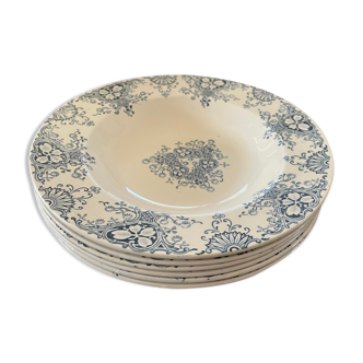 Lot de sept assiettes creuses de la faïencerie de saint amand, modèle "jardinière", début 20 ème. Elles sont en bon état, une assiette a une petite égrenure sur le bord et trois autres ont un petit manque de matière en dessous.
