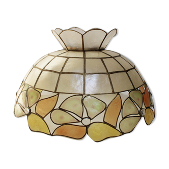 Luminaire d'époque en bambou, nacre et laiton. Très tendance, il sera splendide dans votre déco bohème ou vintage. Longueur fil avec fiche 40cm.