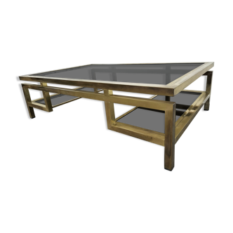 Table basse années 70 space age. Plateau en verre fumé avec un léger accroc dans un angle (voir photos) mais peu visible. Piètement métal chrome de 4cm doublé de laiton 2 cm sur le dessus tbe. Hauteur: 35.5 cm.