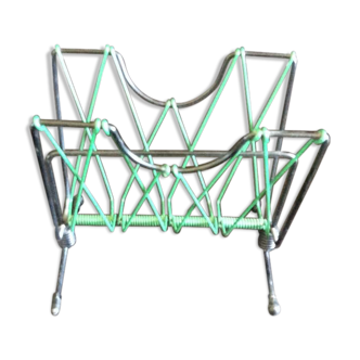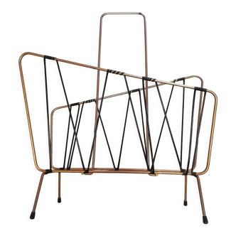 Etagère murale 1960, en métal noir, plateau formica et scoubidou jaune. Petite déformation de la tablette, invisible quand des objets sont posés dessus. Dimensions: longueur 55, 5 cm; hauteur 20 cm; profondeur 18, 5 cm.