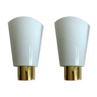 Paire d’appliques vintage composées d’une structure en métal chromé et d’un abat-jour cylindrique en verre blanc décoré d’une trame de fines lignes. Ce modèle typique des années 60/70 conviendra aussi bien à un intérieur de style rétro, que space age et moderne. Ces lampes murales sont en bon état et équipées de leur système électrique d’origine.