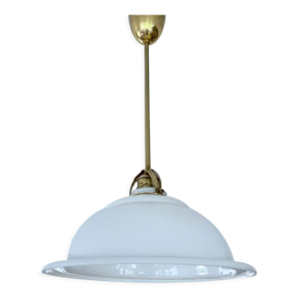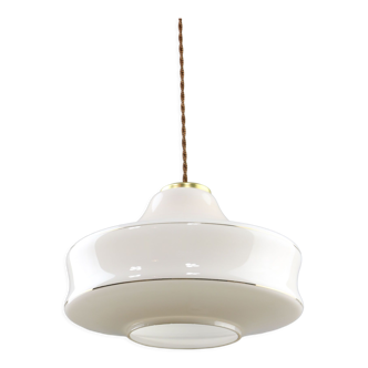 Suspension estampillée raynith du milieu du xxème. Structure en verre moulé en forme de losange: le bas est blanc et brillant et. Le haut est mercurisé ce qui fait office de réflecteur. La hauteur est réglable grace à la chaine avec une hauteur maximum de 110 cm / 44", la hauteur minimum est de 70 cm / 28" En bon état vintage. Quelques traces d'usage sur le réflecteur (cf photos) Douille e14.