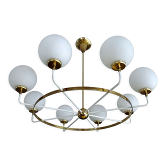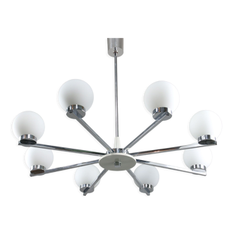Ce grand lustre date de la première moitié du XXe siècle et reflète la clarté géométrique de l'Art Déco avec une influence Bauhaus. Sa composition radiale équilibrée incarne les principes du design moderniste de l'entre-deux-guerres. La structure est en métal chromé, supportant plusieurs bras disposés symétriquement. Chaque bras porte un abat-jour en verre opalin de ton crème doux. La pièce est en très bon état vintage, avec une patine cohérente avec son âge. Son échelle et sa composition en font un élément central idéal pour les grands intérieurs. Le câblage doit être vérifié par un électricien qualifié dans votre pays avant l'installation.