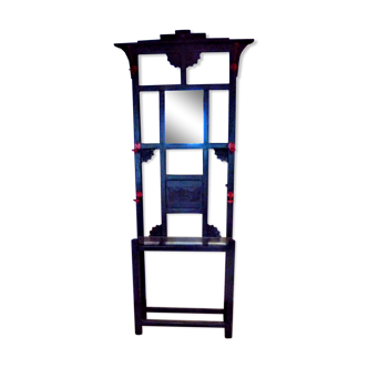 Porte manteaux & parapluies en bois avec cinq patères en métal patinées. Le bois a été sablé afin de retrouver sa teinte naturelle, puis légèrement poncé pour une jolie finition. Le miroir losange biseauté est en bon état, un peu piqué pour le charme et le coin droit abîmé. Les patères ont été décapées au vinaigre blanc et gros sel, mais pas mises à blanc pour garder la belle patine de la peinture d’origine et éviter le côté clinquant. On craque pour les jolies volutes et le travail du bois. En bon état, prévoir une fixation au mur.