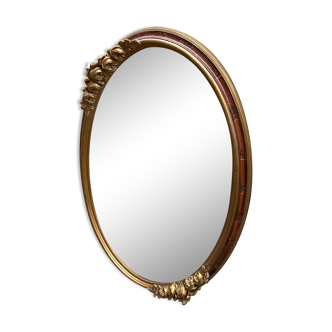 Petit miroir art déco de forme ovale à décor de 4 bouquets de roses argentées et entourage faux bois. Très bon état. Dimensions: largeur 36 cm hauteur 46 cm épaisseur 4 cm.