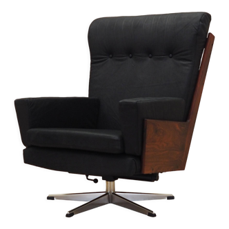 Une pièce rare pour le véritable passionné: ce fauteuil De Sede DS-35 vintage original du début des années 1970 témoigne du savoir-faire suisse. Revêtu d'un luxueux cuir aniline couleur crème, il repose sur un élégant piètement pivotant chromé – un détail discret qui confère une allure sereine. Plus qu'un simple fauteuil, il invite à la détente et au bien-être. La profondeur généreuse de l'assise, les larges accoudoirs et le cuir souple du revêtement offrent un confort exceptionnel. Tout est d'origine, y compris le cuir, magnifiquement patiné par le temps, avec des plis caractéristiques. Certaines parties de la structure ont été réparées et recollées par des professionnels, lui redonnant solidité et durabilité. Bien que ce fauteuil ne porte pas d'étiquette de marque – ce qui est courant pour ce modèle –, il s'agit indéniablement d'un De Sede. Son design, sa fabrication et ses matériaux ne laissent aucun doute. De Sede est mondialement reconnu pour sa précision artisanale, née d'une sellerie à Klingnau. Ce fauteuil DS-35 incarne à la perfection cet héritage: rare, élégant et conçu pour durer des générations. Dimensions: Hauteur: 72 cm, Largeur: 85 cm, Profondeur: 73 cm, Hauteur d'assise: 38 cm, Largeur d'assise: 58 cm, Profondeur d'assise: 54 cm. Designer: Équipe de design De Sede. Pays d'origine: Suisse. Époque: Début des années 1970. Matériaux: Cuir aniline, métal chromé. Restauration: Revêtement d'origine, structure réparée et recollée. Particularité: Modèle original, design rare.