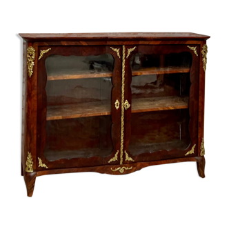 Magnifique bibliothèque/vitrine ancienne en loupe de noyer. En parfait état d'origine. Les vitres, irrégulières, sont d'origine. La facture est d'une finesse et d'une beauté exceptionnelles, avec d'impressionnantes incrustations et des ornements en bronze. Les angles arrondis lui confèrent un charme particulier et témoignent de sa qualité. L'intérieur est recouvert de velours d'origine. La vitrine présente une belle patine. Modèle unique. Origine : Angleterre. Époque : Vers 1870 (époque victorienne). Dimensions : L. 122 cm, P. 32 cm, H. 102 cm.